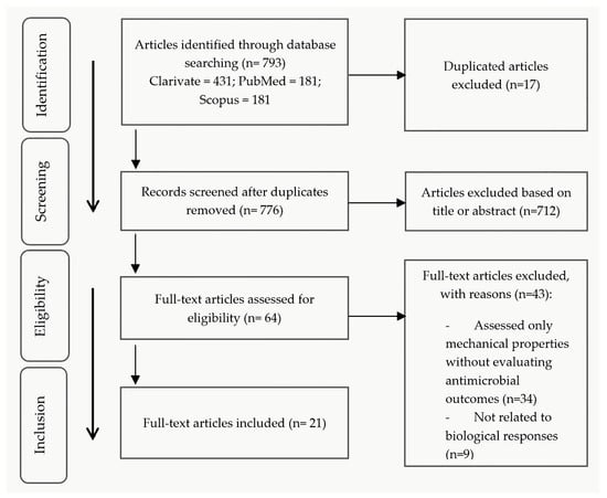 The search identified 793 articles, and after removing duplicates, 776 articles were assessed. Based on the title and abstract, 712 articles were excluded. After applying the eligibility criteria, 64 full texts were analyzed, and upon review, 21 articles were included in the study (Figure 2).