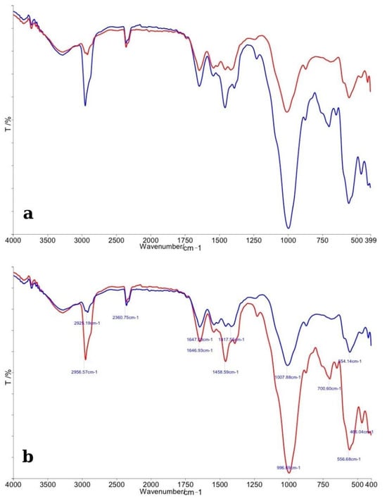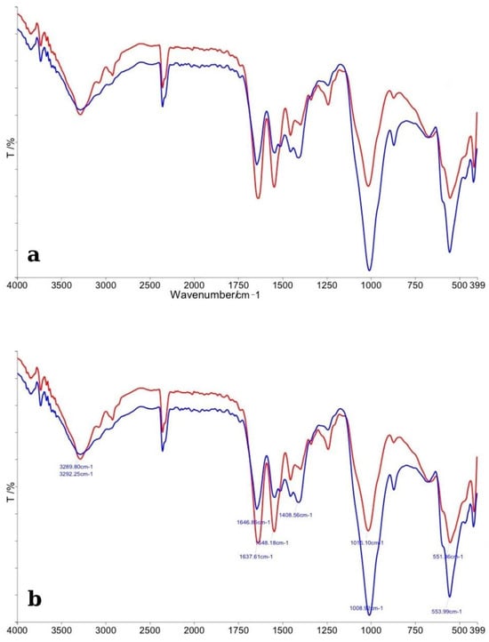 The FTIR spectra obtained for enamel specimens treated with Opalescence Boost and their corresponding control samples are presented in Figure 2. In panel (a), the comparative spectra display the overall differences between the control group (red line) and the bleached enamel (blue line). Both spectra exhibit the characteristic absorption bands associated with enamel’s inorganic matrix, mainly phosphate (PO43−) and carbonate (CO32−) functional groups.