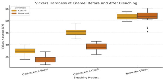 Although our study employed only in-office bleaching agents with relatively shorter application times, the observed reduction in enamel hardness—particularly in the Opalescence Boost group—aligns with prior evidence that oxidative stress from hydrogen peroxide can disrupt the enamel mineral matrix. These results support previous conclusions that peroxide-based whitening agents, regardless of application mode, may compromise enamel’s mechanical stability. Moreover, findings from Ghanbarzadeh et al. [] highlight that bleaching has an even more pronounced impact on demineralized enamel, reinforcing the importance of evaluating pre-existing enamel conditions prior to treatment. Finally, variations in enamel surface preparation, such as polishing, may further influence susceptibility to bleaching-induced damage, as suggested by Pessanha et al. [], although in our study, all specimens were standardized through uniform polishing to limit such variability [].