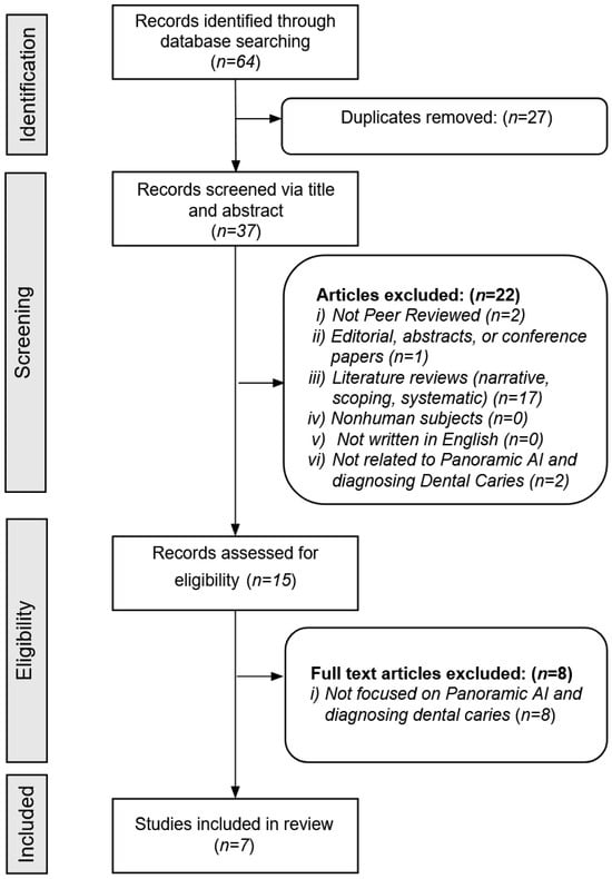 The reviewers conducted a comprehensive literature search across four electronic databases—PubMed, Scopus, Web of Science, and Dentistry and Oral Sciences Source—to identify relevant studies published up to September 2024. The search strategy, developed in collaboration with a medical librarian, combined controlled vocabulary terms and free-text keywords related to artificial intelligence, panoramic radiography, dental caries, diagnosis, advantages, and disadvantages. The search used Boolean operators to ensure comprehensive retrieval of relevant literature and an English-language filter across all databases. Keywords and MeSH terms included “artificial intelligence”, “machine learning”, “deep learning”, “panoramic radiography”, “dental caries”, and “diagnosis”. The search yielded a total of 64 records: 17 from PubMed, 33 from Scopus, 8 from Web of Science, and six from Dentistry & Oral Sciences Source. Table 1 summarizes the query used for screening.