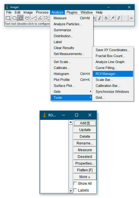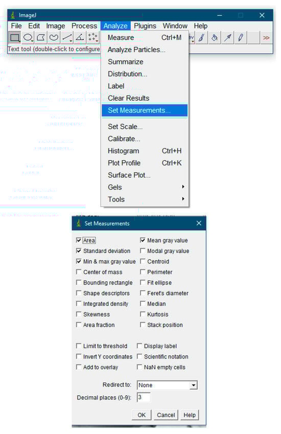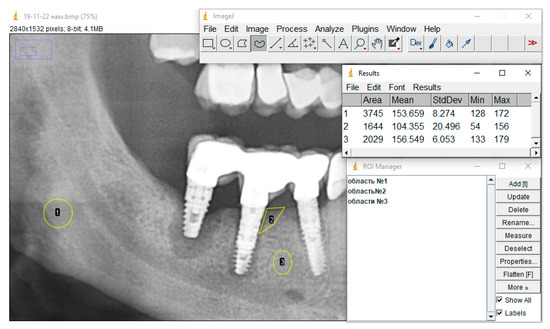 Indeed, ImageJ allows the user to manually select areas of interest, calculate the statistical characteristics of the selected areas, and perform batch processing. For the selected area, the number of pixels, the average gray value of the selected area (optical bone tissue density), standard deviation, maximum and minimum values, and other statistical characteristics are automatically calculated.
