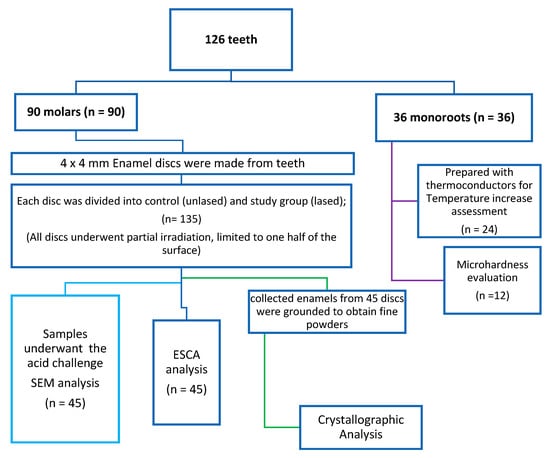 This study investigated the effectiveness of a 450 nm diode laser in enhancing enamel resistance to acid attacks and aimed to characterize the chemical and structural changes induced by laser irradiation. A total of 126 extracted caries-free permanent human teeth were stored in a HEPES buffer solution (4 °C, pH 7.2) containing 2 mmol/L HEPES and 0.19 mmol/L sodium azide (NaN3). From 90 teeth, 135 enamel discs measuring 4 × 4 mm were prepared (Figure 1). Additionally, 24 single-root specimens were reserved for safety assessment, specifically to evaluate pulp temperature increase during laser exposure. Only 12 teeth were used to assess the microhardness of laser-treated and -untreated enamels. For scanning electron microscopy (SEM), electron spectroscopy for chemical analysis (ESCA), and the spectroscopy, 45 enamel discs were allocated to each technique (Figure 1).