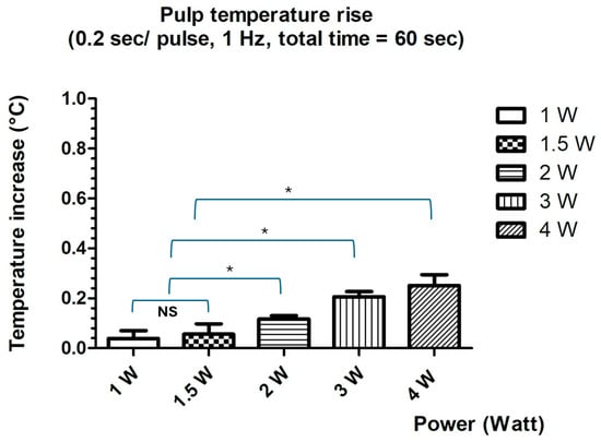 Mean values and standard deviations of temperature increase at pulp ceiling at different laser power settings. NS = No significant difference was observed; * (asterisk) = statistically significant differences were observed.