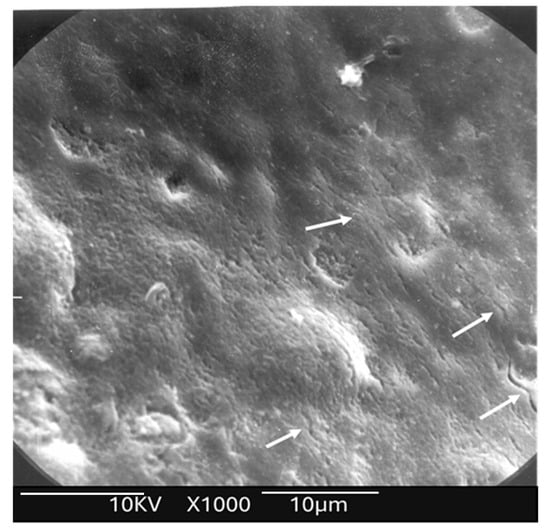 Scanning electron microscopy (SEM) analysis of the study group prior to acid application revealed evidence of enamel surface melting, characterized by the presence of multiple microcracks. White arrows show the existence of several cracks.