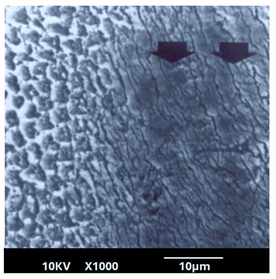 Scanning electron microscopy (SEM) image showing both the control group (left half) and the lased study group (right half) after acid application. Arrows indicate lased enamel that shows several cracks. The lased region appears comparatively less affected by acid-induced dissolution.