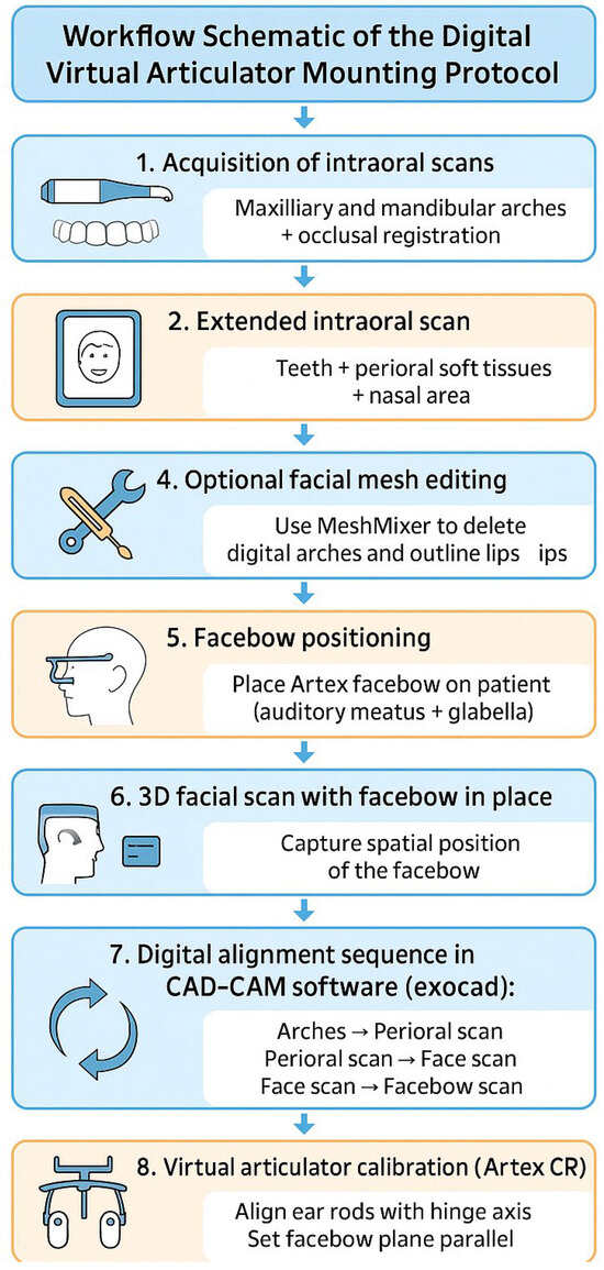 Despite these advantages, certain limitations must be acknowledged. First, the protocol requires the use of multiple digital platforms, including intraoral scanning software, 3D facial scanning applications, mesh editing tools, and advanced CAD software with virtual articulator modules. This multisystem integration may be technically demanding and time-consuming, particularly for clinicians unfamiliar with digital workflows. Additionally, the learning curve associated with 3D mesh alignment and virtual articulator calibration can be steep, necessitating adequate training and clinical experience to ensure reliable outcomes [].