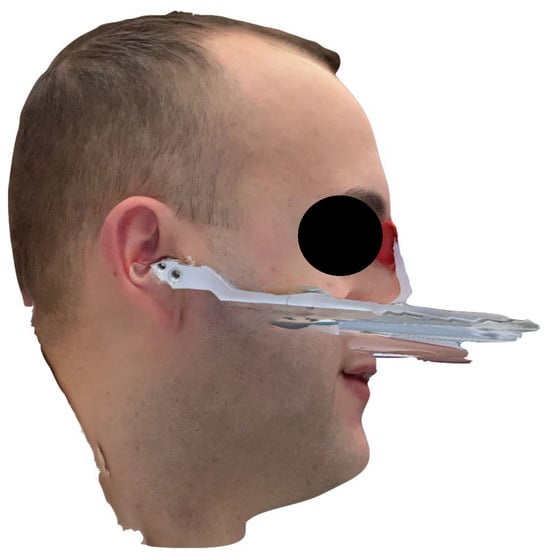 The resulting mesh file was exported and optionally refined using 3D mesh editing software (MeshMixer® 3.5.474; Autodesk, San Rafael, CA, USA) to isolate the facial scan by removing the dental arches and defining the labial boundaries. Then, an Artex facebow (AmannGirrbach, Koblach, Austria) was assembled and positioned on the patient, ensuring stability at the external auditory meatus and glabella []. A second facial scan was then performed while the facebow was in place, enabling digital capture of its position in relation to the patient’s head. A matting spray could be applied to prevent scanning distortions, considering that the facebow material is metallic.