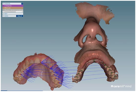 The matching steps of all scans, namely the alignment of the upper arch scan with the perioral soft tissue scan (Figure 4), the alignment between the perioral soft tissue scan and the full facial scan (Figure 5), and the superimposition of the face-only scan with the facial scan acquired with the facebow in place (Figure 6), were performed smoothly using the CAD/CAM software. Common anatomical landmarks were manually selected, and the ‘best match’ function was employed to facilitate the process. This phase required approximately 2 min to complete.