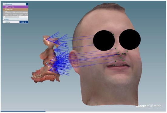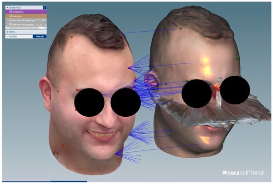 Superimposition of the face-only scan with the facial scan acquired while the facebow was in place was performed using common anatomical landmarks to ensure precise alignment.