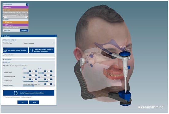 Subsequently, the mounted plaster models of the maxillary and mandibular arches were digitized using a bench-top optical scanner (Ceramill mind, AmannGirrbach). This produced 3D digital models that were imported into a virtual articulator software configured with parameters corresponding to the Artex CR articulator. In this way, the alignment and movement settings of the Artex CR were preserved in the virtual environment, maintaining the proper occlusal relationships.