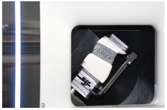 The position of the maxilla was recorded using a facebow, and the models in maximum intercuspation were mounted on an Artex CR articulator according to the manufacturer’s instructions (Figure 9). The models were scanned using a desktop scanner (Figure 10). Thus, the orientation of the upper arch was obtained through the analog workflow (Model 0).