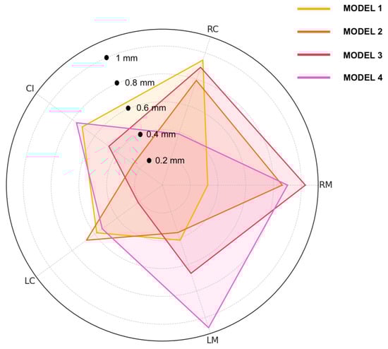 Radar plot representing the distances (in mm) from the analog-mounted model for each reference point (RM, RC, CI, LC, LM) across the four digitally mounted models.