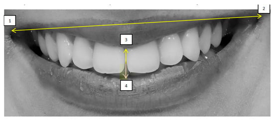 - Smile width, defined by the most posterior visible tooth (canine, first premolar, second premolar, or first molar) [27];