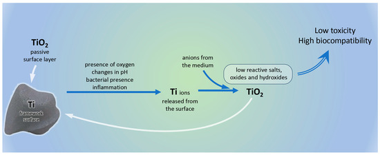 The rapid spontaneous formation of surface layer of TiO2 leads to high corrosion resistance of titanium and its alloys [14,15,16,17,18,19,20]. However, some specific environmental factors in the oral cavity, like changes in acidity, bacteria, inflammatory diseases, tribocorrosion, and even tooth brushing and fluor-containing mouthwashes, may cause partial degradation of the passive layer [16,21,22,23,24]. As a result, ions and particles from the metal restoration are disseminated in the surrounding tissues and may be spread in distant areas of the body. Titanium ions emitted from the surface interact with anions present in the medium, forming hydroxides, oxides, and salts, which hardly react with other biomolecules [25]. The fast formation of low-reactive compounds explains the high biocompatibility of titanium and its alloys (Figure 1). Although scarce, there is evidence for pathological effects of titanium—potential change in oxidative stress levels, cellular disturbances, cases of hypersensitivity [26,27].