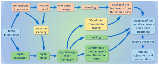 Steps of production of titanium–ceramic dental restorations: conventional production technique (orange), CAD/CAM techniques (green) and possible cross paths between the two major groups (yellow).