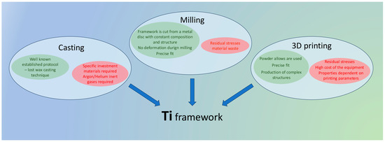With the development and widespread of computer-aided design/computer-aided manufacturing (CAD/CAM techniques), titanium frameworks for metal–ceramic restorations can be produced by milling of titanium disks (cpTi or titanium alloys). One of the advantages of milling is the use of prefabricated cpTi (commercially pure titanium) or titanium alloys with constant composition and structure. Other advantages include lack of deformation of the final object during production and receiving a framework, precisely corresponding to the digitally created design [31]. However, this subtractive method may cause surface changes and residual stresses, affecting some properties of the restoration [32]. The amount of waste material is also a matter of concern.