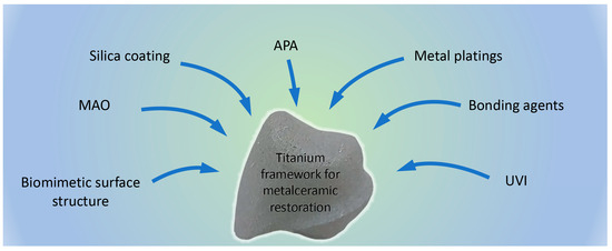 The control of thickness and structure of the surface oxide layer is challenging and crucial for the formation of the titanium–ceramic bond. Prior to ceramic veneering, different surface treatment methods may be applied, resulting in formation of either a controlled oxide layer with desired thickness and firmness, or an interlayer providing higher bond strength by adding specific elements on the interface between the alloy and the ceramic material. Metal–ceramic bond strength may be modified by different approaches, as shown in Figure 4 and Table 2.