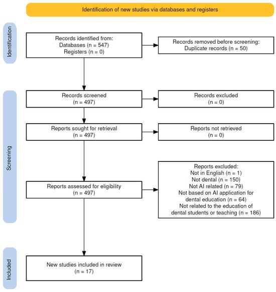 A total of 547 records were identified through database searches. After removing 50 duplicates, 497 records were screened. Following the application of inclusion and exclusion criteria, 17 empirical studies were selected for inclusion in the review. Two reviewers assessed the full texts of all 497 articles. They reached an agreement on excluding 480 studies due to reasons such as lack of empirical data, absence of focus on dental students, or classification as commentary or editorial pieces. The complete study selection process is illustrated in the PRISMA flow diagram (Figure 1). All studies that met the eligibility criteria during full-text assessment were included in the final synthesis.