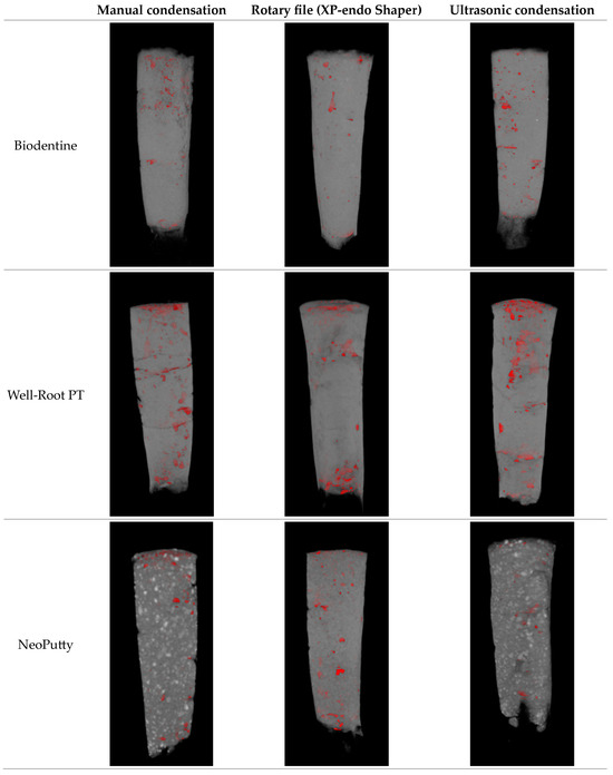Representative micro-CT images of apical plugs, created with different materials and condensation techniques with superimposed voids (red color).