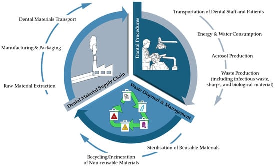 Dentistry, though a relatively small sector, significantly impacts the environment through its reliance on the dental material supply chain, energy-intensive technologies, excessive water consumption, patient and staff travel, and the widespread use of single-use and non-recyclable materials [], as shown in Figure 1.