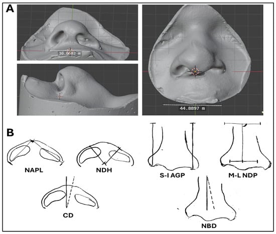 These molds were used to assess the nasal symmetry parameters, described by Barillas and cols. Ref. [25], using a digital caliper. In order to minimize measurement error, all parameters were measured twice, and the mean value of each parameter was used in the present study. Measurements were taken directly from the plaster casts using a digital caliper, without the use of any software, and the molds were not digitized (Figure 1B).