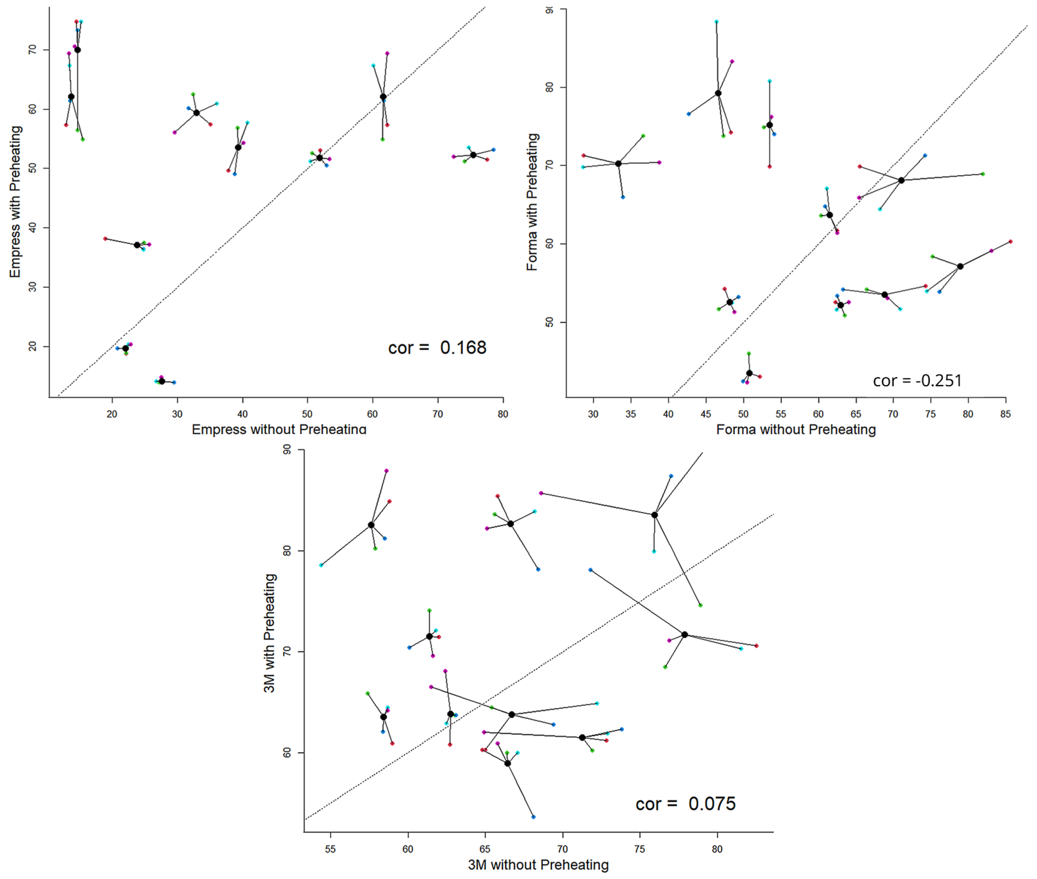Considering the average Knoop microhardness value of each fragment obtained with and without preheating for each fragment and treating each fragment as a different sample, it was determined that the samples of Empress and 3M-ESPE achieved the highest hardness values with preheating. Simultaneously, Forma demonstrated consistent behavior, performed similarly both above and below the baseline. This indicates that Empress tends to increase in microhardness with preheating, as does 3M-ESPE, although they are not correlated. Additionally, Forma also exhibits this tendency, albeit with a decreasing trend (Figure 1).