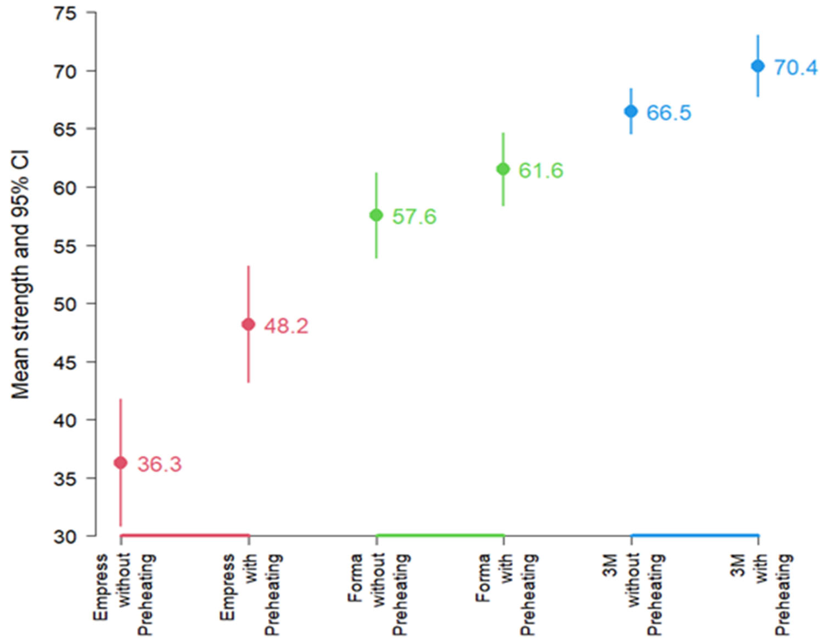 A hypothesis test for paired samples using the t-Student test was performed to compare preheated versus non-preheated groups for each resin. The results confirmed significant differences in microhardness between preheating and non-preheating for Empress (p: 0.001268) and 3M-ESPE (p: 0.02097). However, Forma (p: 0.1571) did not exhibit a significant difference at the average level.