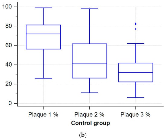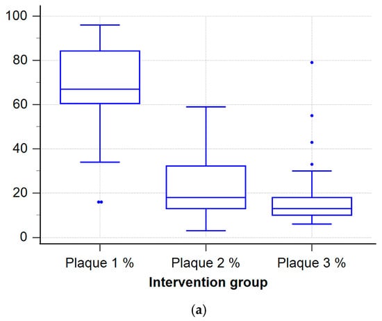 Changes in plaque index over three time points were analyzed in both the intervention group (iTOP) and the control group (non-iTOP). Results are shown in box plots (Figure 1a,b) illustrating the distribution, median, interquartile range, and outliers for each group across all time points. In the iTOP group, plaque index significantly decreased from baseline to the 2-year follow-up. In contrast, the non-iTOP group showed a smaller and more variable reduction in plaque index, with values remaining higher than in the iTOP group across all time points.