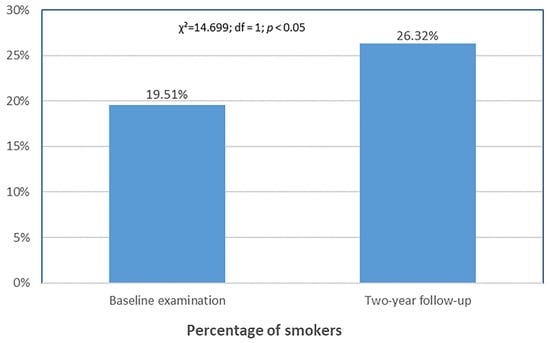 Figure 2 shows a significant increase in self-reported smoking at the 2-year follow-up compared with baseline (p < 0.05).
