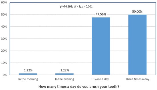 Differences in toothbrushing frequency. Distribution of responses differed significantly across categories (χ2 = 74.293, df = 3, p < 0.001).