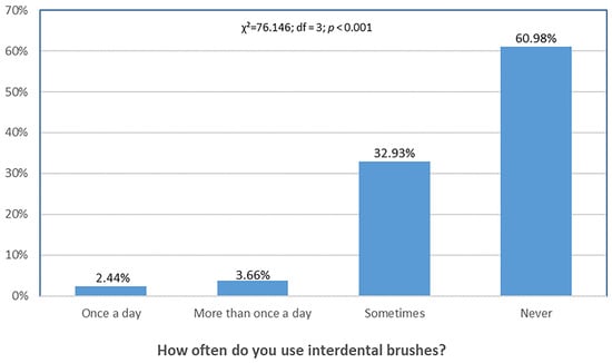 Differences in frequency of interdental brush use. Distribution of responses differed significantly across categories (χ2 = 76.146, df = 3, p < 0.001).