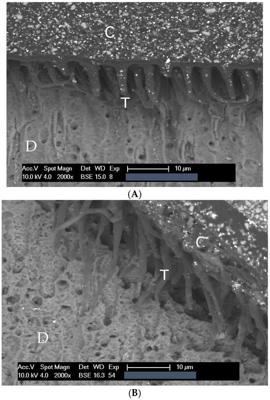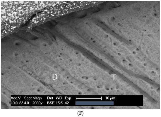 SEM images of the interaction zone for the groups (A) G1: E-F, (B) G2: E-F-TB, (C) G3: E-P3W-F-TB, (D) G4: E-P1.5W-F-TB, (E) G5: P3W-E-F-TB, and (F) G6: P3W-F-TB. Markings within the images; C: composite, T: resin tags, and D: dentin.