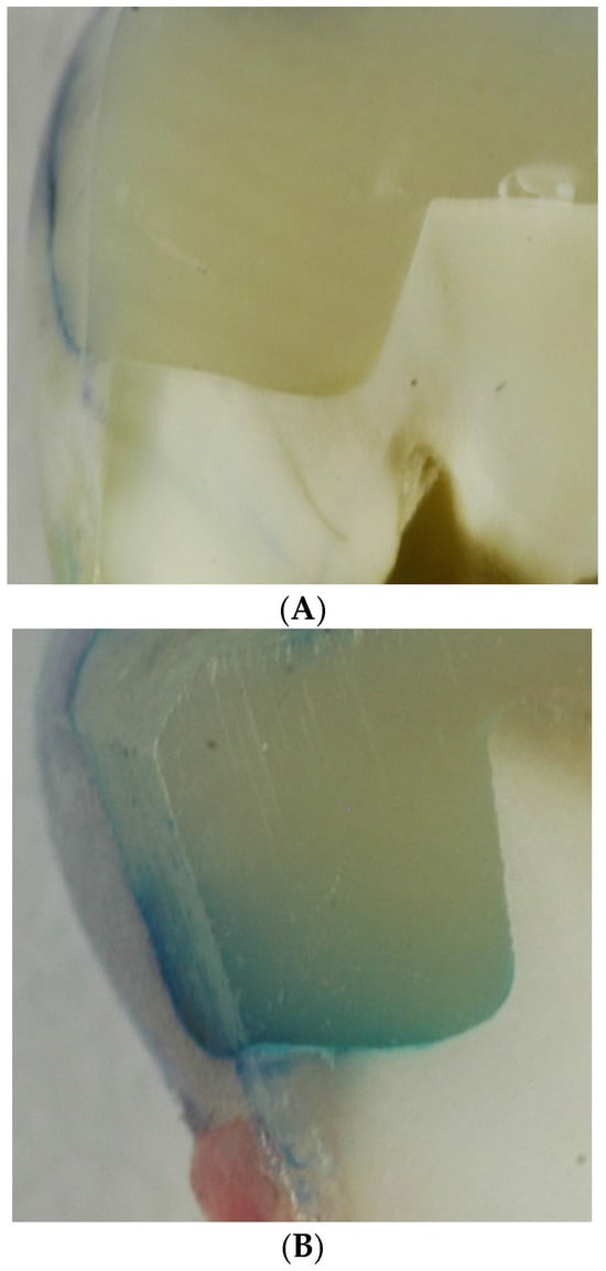 The root apices of the teeth were sealed with sticky wax, and all surfaces were coated with two layers of nail varnish from beyond 1 mm of the gingival margin of the restorations. The teeth were soaked in 0.1% methylene blue dye in a 37 °C water bath for 24 h.