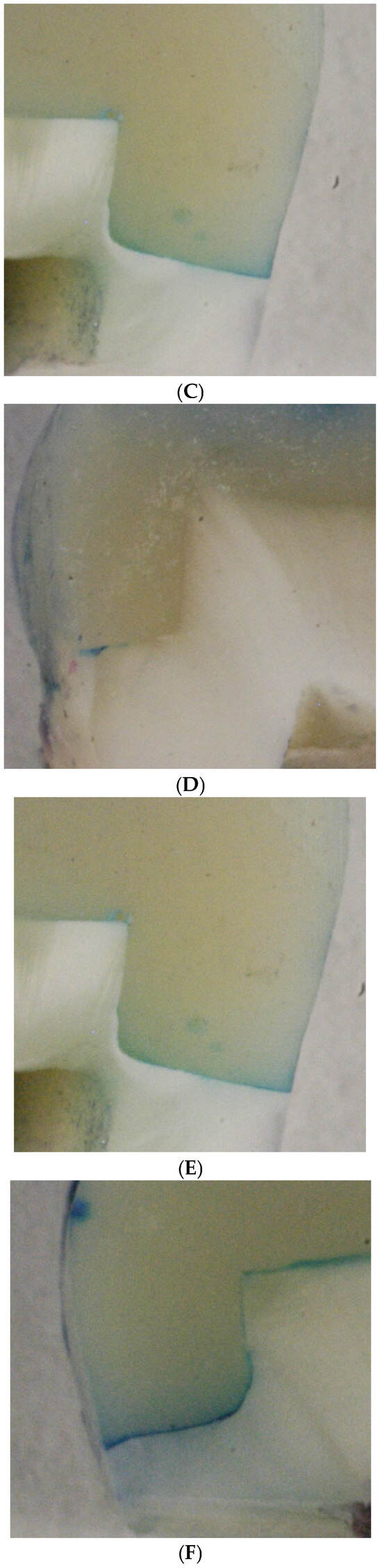 Light-microscopic images of the dye penetration (blue stain) into the interaction zone for the groups (A) G1: E-F, (B) G2: E-F-TB, (C) G3: E-P3W-F-TB, (D) G4: E-P1.5W-F-TB, (E) G5: P3W-E-F-TB, and (F) G6: P3W-F-TB.