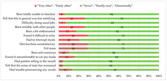 - John, M.T.; Omara, M.; Su, N.; List, T.; Sekulic, S.; Häggman-Henrikson, B.; Visscher, C.M.; Bekes, K.; Reissmann, D.R.; Baba, K.; et al. Recommendations for use and scoring of Oral Health Impact Profile versions. J. Evid.-Based Dent. Pract. 2022, 22, 101619. [Google Scholar] [CrossRef] [PubMed]