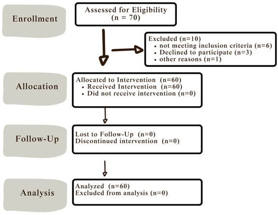 Patient Flow: Initially, 70 patients were assessed for eligibility; of these, 10 were excluded. Consequently, a total of 60 patients were enrolled in one group (n = 60). All patients received their allocated intervention (bonded bite turbos on the palatal surfaces of the maxillary central incisors). All patients completed the one week and one month follow-up period, and data from all 60 patients were included in the final analysis, as summarized in Figure 4.