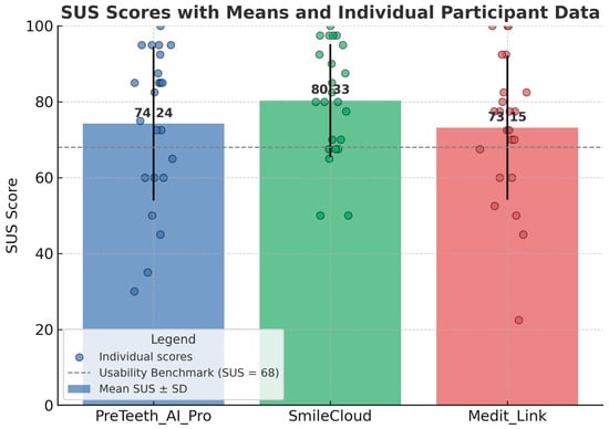 Mean SUS scores with standard deviations (bars) and individual participant scores (dots) for the three evaluated Digital Smile Design software tools (PreTeeth AI Pro, SmileCloud, Medit Link). SmileCloud achieved the highest mean SUS score (80.33), exceeding the usability benchmark of 68, and demonstrated the lowest variability among participants. PreTeeth AI Pro (74.24) and Medit Link (73.15) also exceeded the benchmark but showed greater dispersion in user ratings. The dashed horizontal line represents the SUS usability benchmark (68).