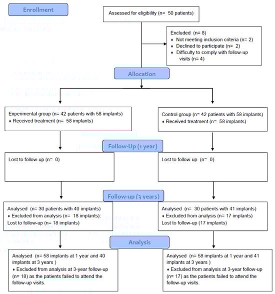 Fifty patients were screened for eligibility, and 42 were included (Figure 1). The reasons for exclusion were non-meeting of the inclusion criteria (two patients), decline to participate (two patients), and difficulty complying with the scheduled follow-up visits (four patients). During the follow-up, 12 patients failed to attend the 3-year follow-up visit. The analysis was performed for 58 implants in each group at 1-year follow-up. At 3-year follow-up, the test group had 40 implants and the control group 41 implants (Figure 1). One lost patient had two test implants and one control implant.