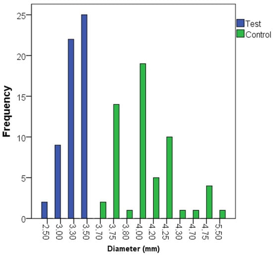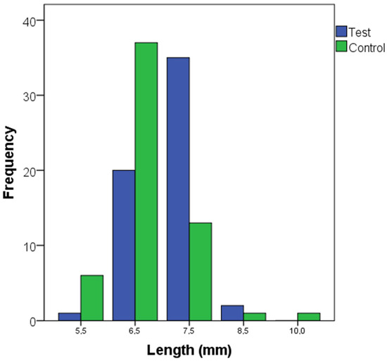 The distribution of the lengths and diameters of the dental implants is described in Figure 2 and Figure 3. The most frequent implant lengths were 6.5 and 7.5 mm in the control and test groups, respectively. The baseline characteristics between the test and control groups are described in Table 2, including bone type, insertion torque, and loading protocol. Bone quality was categorized into Types I to IV, with the test group showing more Type I cases and fewer Type IV cases compared to the control group. Insertion torque was similar between groups, with median values of 60 Ncm for both groups (p = 0.888). Loading protocols (immediate and delayed) were also balanced, with no significant differences between the study groups (p = 1.000).
