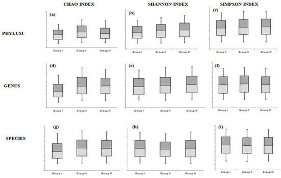 The differences among the 3 study groups at the phylum level according to the Chao index (a), Shannon index (b), and Simpson index (c); at the genus level according to the Chao index (d), Shannon index (e), and Simpson index (f); and at the species level according to the Chao index (g), Shannon index (h), and Simpson index (i).