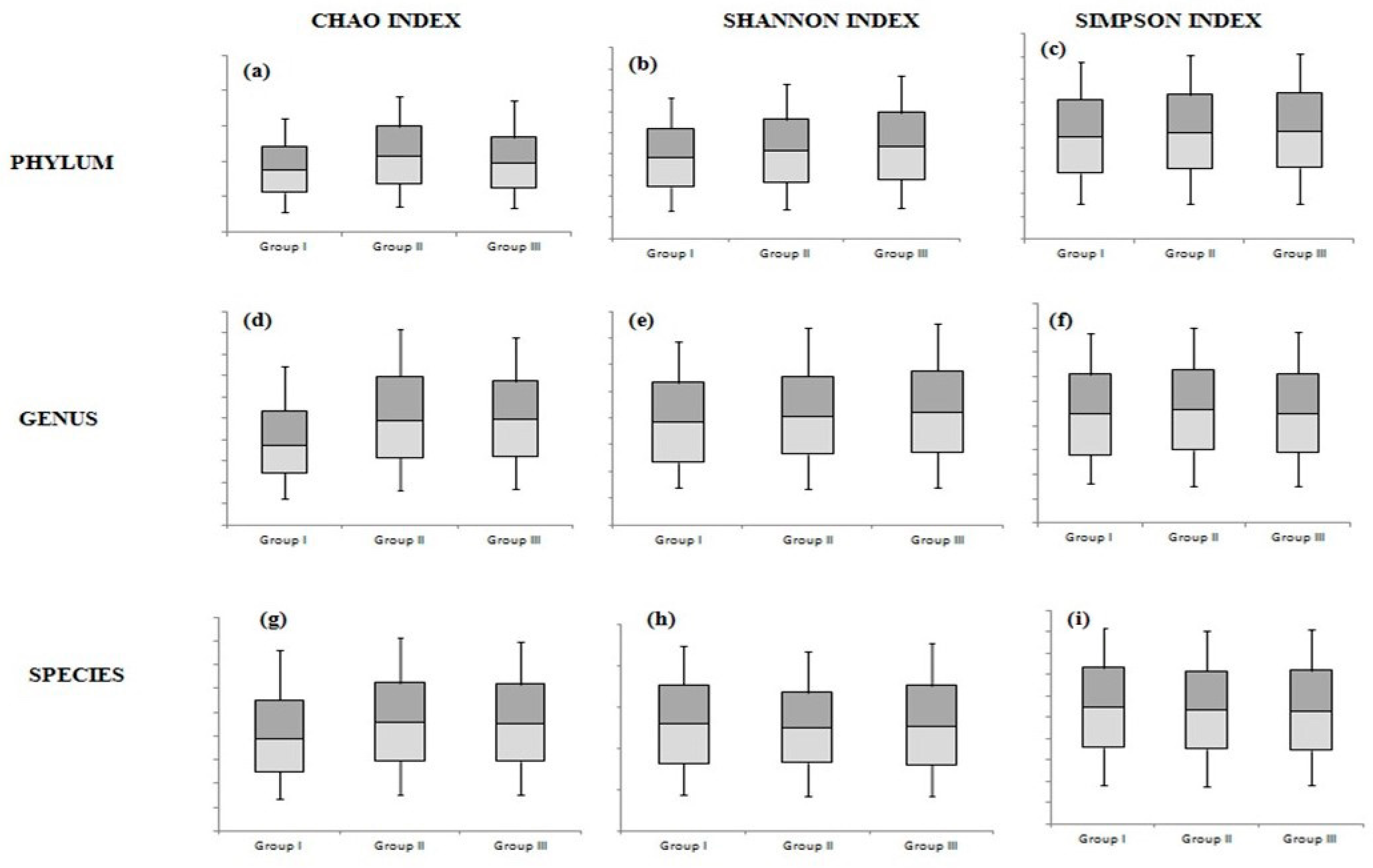 3.2. Characteristics of 16S rRNA Gene at Phylum/Genus/Species Levels