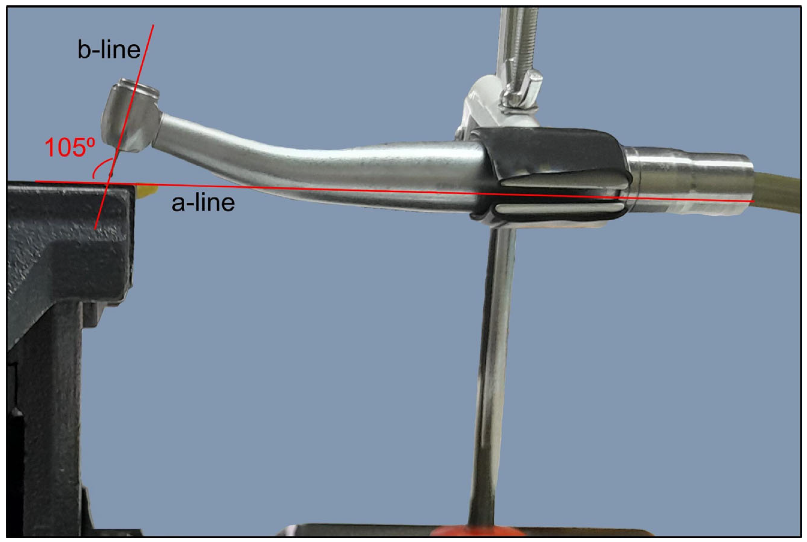 - A steady direction of perforation. Teeth were secured in a vise with their buccal surfaces parallel to the horizontal plane. The high-speed handpiece was also fixed in a horizontal position using a custom-made apparatus that allowed only downward vertical movement. Buccal diagonal perforations, starting 3 mm apical to the coronal surface of the teeth, were created under water cooling with a steady angle of 105° between the external surface of the root and the shank of the bur (Figure 2 and Figure 3). A #35-K stainless steel hand file (Dentsply, Maillefer, Ballaigues, Switzerland) inside the root canal prevented the overextension of the perforation to the lingual surface of the root.