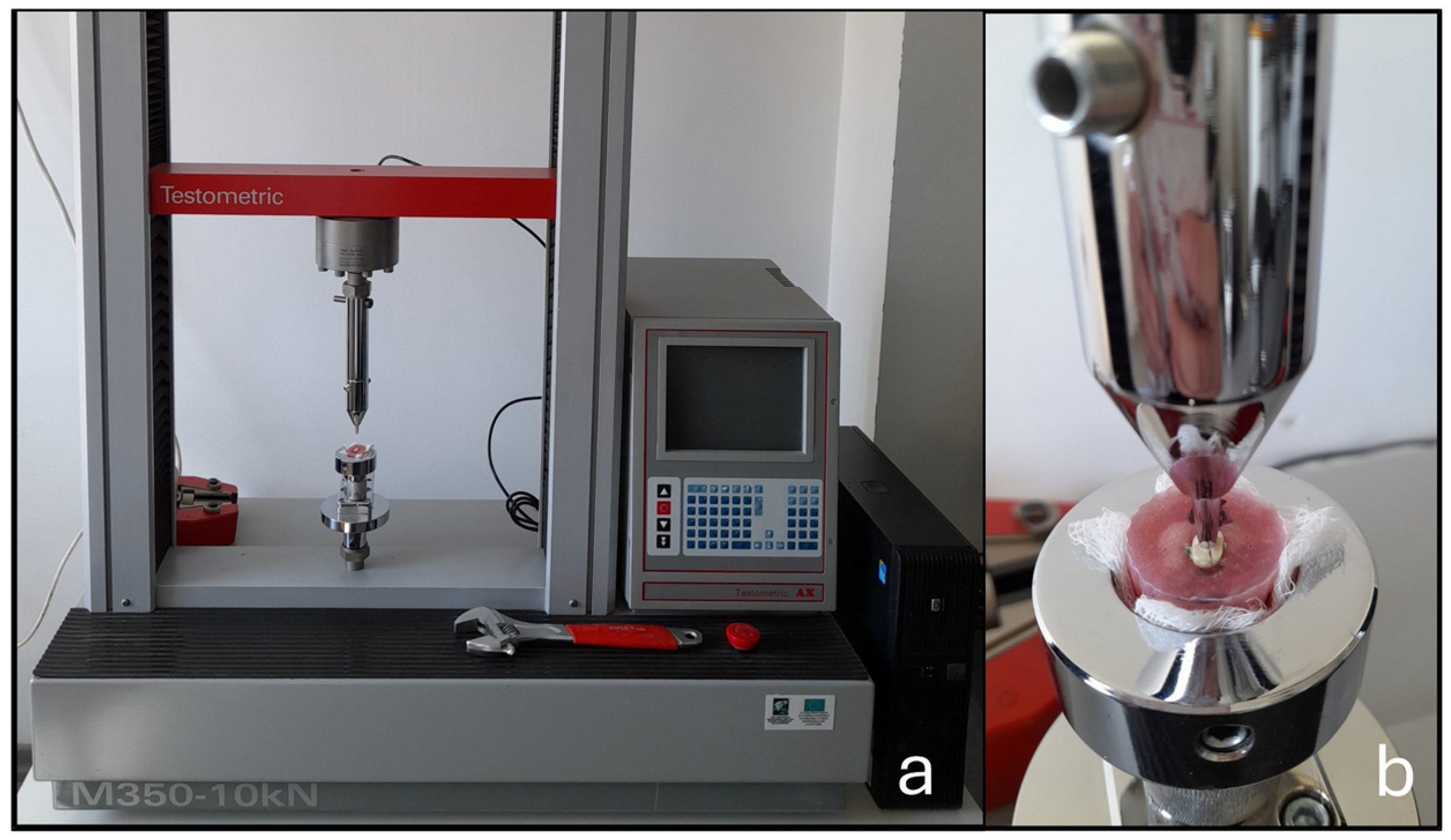 - Naumann, M.; Metzdorf, G.; Fokkinga, W.; Watzke, R.; Sterzenbach, G.; Bayne, S.; Rosentritt, M. Influence of test parameters on in vitro fracture resistance of post-endodontic restorations: A structured review. J. Oral Rehabil. 2009, 36, 299–312. [Google Scholar] [PubMed]