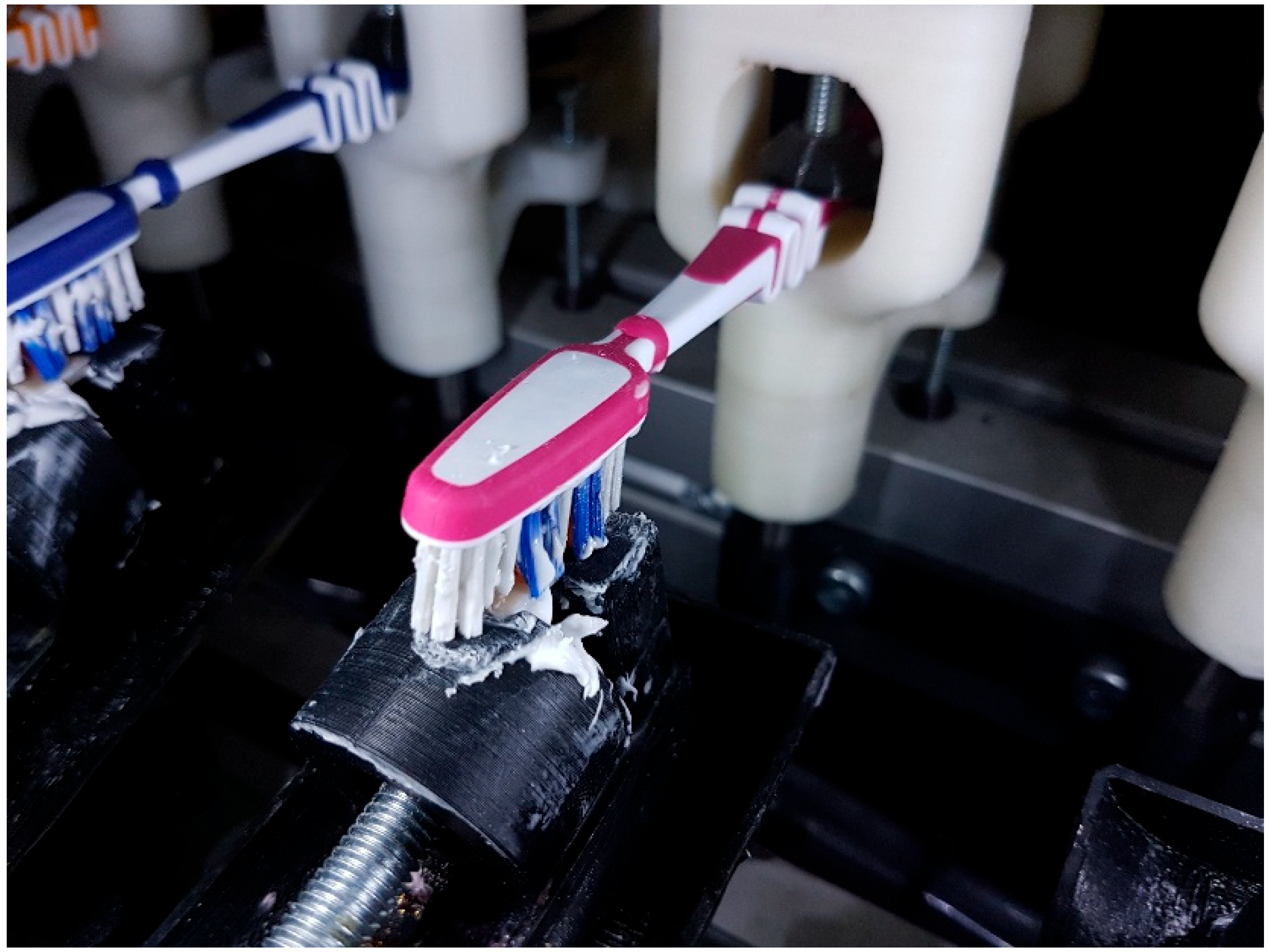 All specimens were subjected to a simulated toothbrushing protocol to replicate one year of clinical oral hygiene. Brushing was performed using a custom-built mechanical brushing simulator (