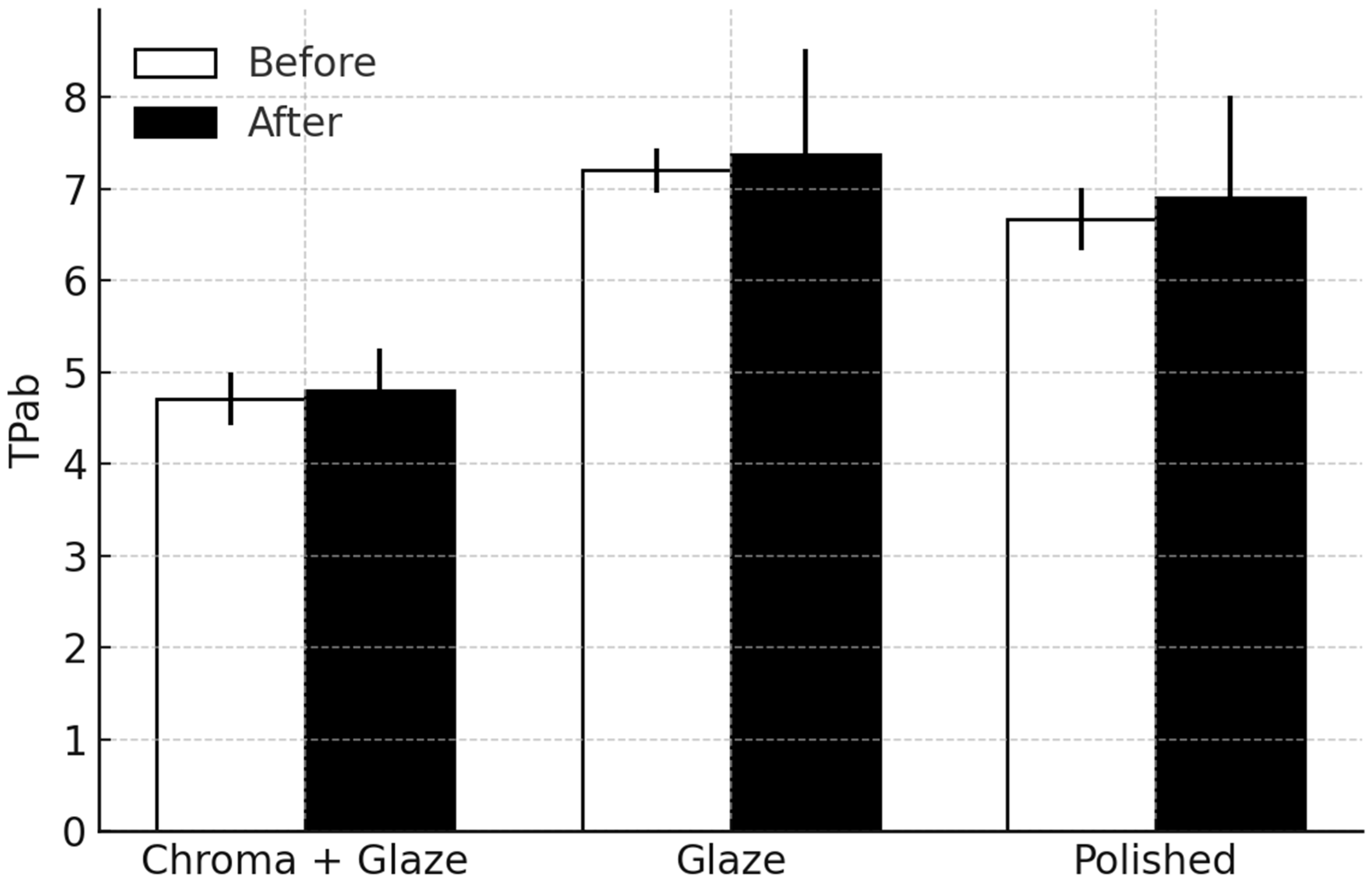 For translucency parameters (TPab and TP00), comparisons between the three finishing protocols (Polished, Glazed, Chroma + Glaze) were performed using the Kruskal–Wallis test, followed by pairwise Mann–Whitney U tests with Bonferroni correction when overall significance was detected. Differences between phases (before vs. after brushing) within each treatment group were analyzed using the Wilcoxon signed-rank test.