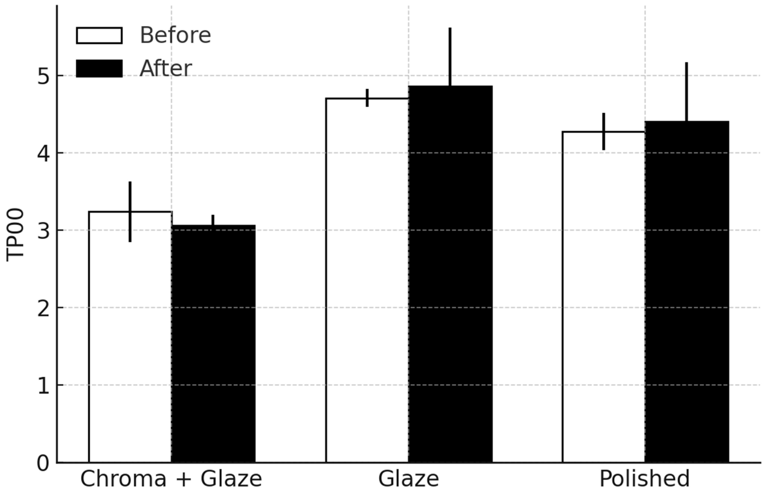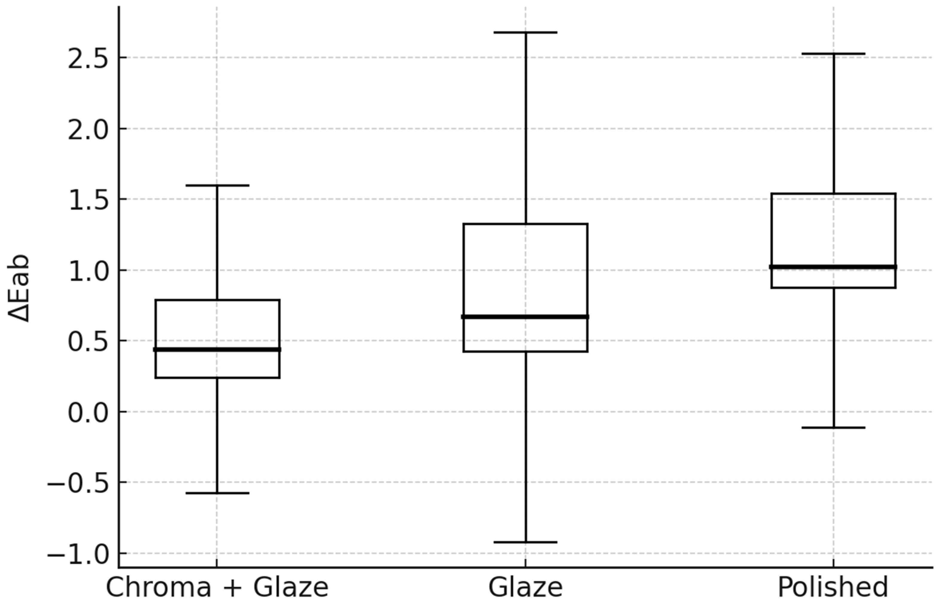 The Chroma + Glaze specimens demonstrated the smallest color changes, with median ΔE00 values around 0.33, which is below the widely accepted perceptibility threshold and therefore considered clinically imperceptible.