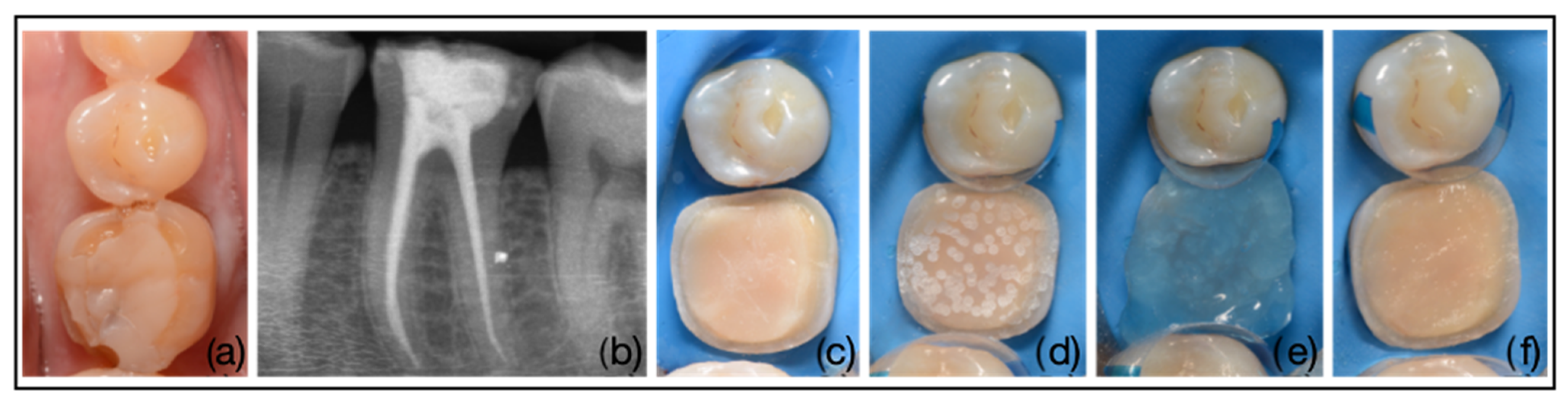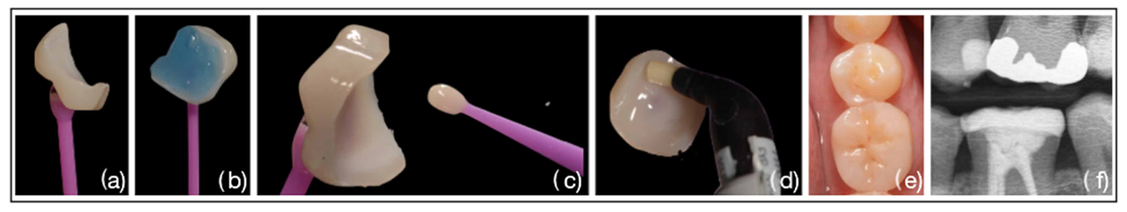 - Abdulsattar, Y.H.; Kadhim, A.J. Effect of immediate dentin sealing on the fracture strength of indirect overlay restorations using different types of luting agents (A comparative in vitro study). J. Conserv. Dent. Endod. 2023, 26, 434–440. [Google Scholar] [CrossRef]