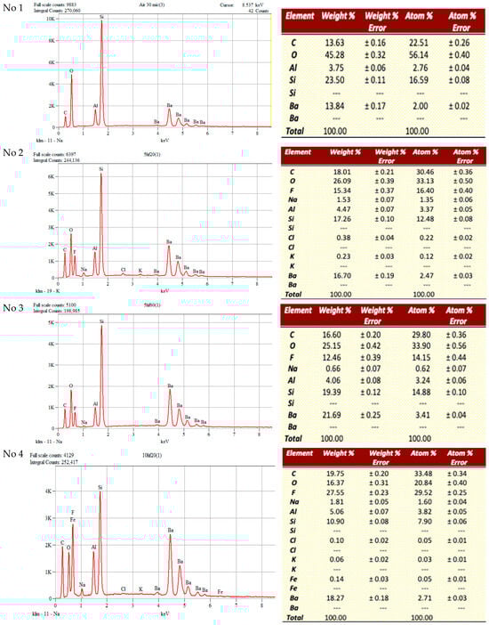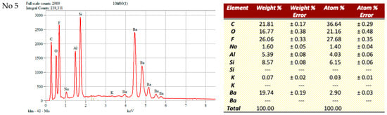 Prior to bonding, the elemental composition of the CAD/CAM composite surfaces was analyzed using Energy-Dispersive X-ray Spectroscopy (EDS) for all five experimental groups and the untreated control (witness). The witness surface presented the typical distribution of carbon (13.45 wt %), silicon (25.00 wt %), and oxygen (43.11 wt %), consistent with the inorganic polymeric matrix of resin nanoceramics [21], along with traces of barium, sodium, and aluminum.