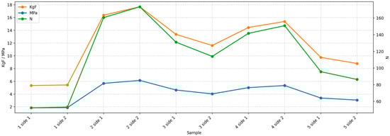 Bond forces, initially expressed in kilogram-force (KgF), were converted into megapascals (MPa) by calculating the applied force in newtons and dividing by the bonding surface area (28.27 mm2). The full dataset, along with the calculated values, is presented in Table 2.