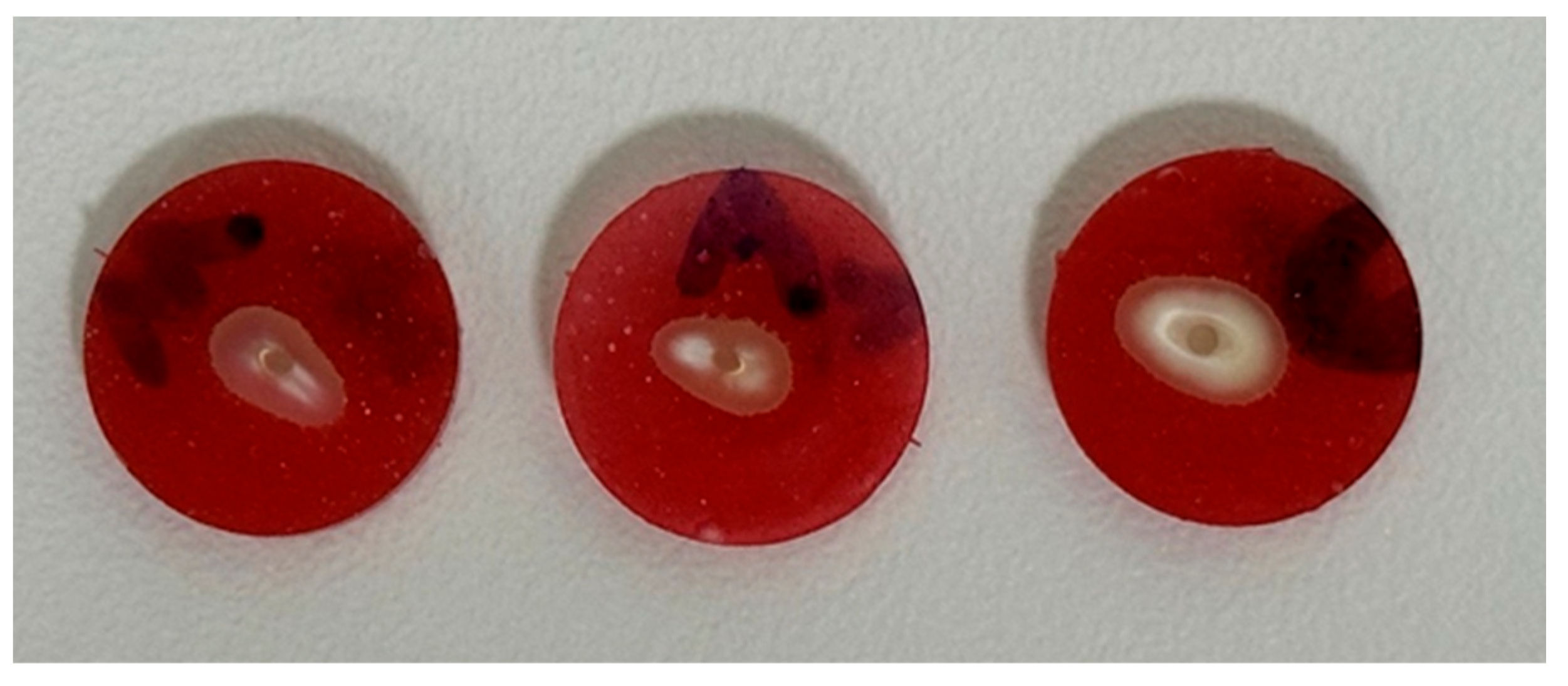 A 0.7 mm segment was first sectioned from the coronal end of the composite core and excluded from analysis. Thereafter, three consecutive slices, each measuring 2.0 mm in thickness, were prepared. These three specimens were designated for bond strength testing (